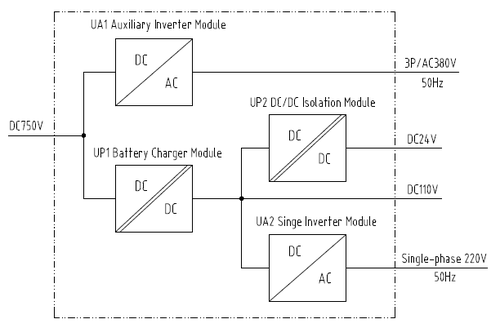 辅助变流器将来自接触网的DC750V直流电压转换成三相380V/50Hz输出给交流负载供电、DC110V输出给蓄电池及110V直流负载供电、DC24V输出给24V直流负载供电、单相220V/50Hz输出给交流负载供电。