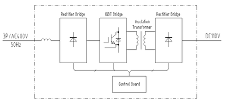 10kW充电机将三相400V/50Hz交流电压转换成与输入隔离的DC110V输出给蓄电池及直流负载供电(输出电压随蓄电池温度变化)。